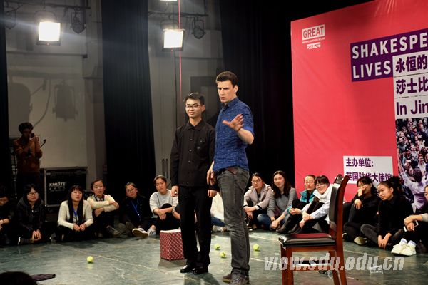 活动上,莎士比亚文学戏剧专家Duncan Lees带来题为《莎士比亚与局外人》的精彩演讲。来自英国莎士比亚环球剧院的专家Jack Murray和Olivia Mace分别通过游戏的方式和师生们互动,并对他们的表演给予了充分肯定。随后,山东大学外语学院尼诺剧社的同学们表演了《哈姆莱特》经典剧目。表演在外国语学院合唱团优美舒缓的乐曲中开始,尼诺剧社用全英文再现了笔下的兄弟阋墙、宫廷阴谋、家庭纷争、为爱殉情,以及狡猾放荡的绅士、鬼怪精灵的仙女、憨厚耿直的家仆、刚正不阿的将军。剧社50余人参与演出,演出阵容庞大,由外语学院教师戏剧博士冯伟担任指导,尼诺剧社社长陈曦兼任导演与主演。演员演技精湛,感情饱满,将剧中的各种人物角色表现得淋漓尽致,赢得现场观众的一致好评。活动最后,莎士比亚环球剧院专家Georghia Ellinas讲述了亨利五世与暴风雨的故事,活动在高潮中结束。山东省外事办公室、山东省文化厅、济南市外事办公室、济南大学相关人员出席相关活动。