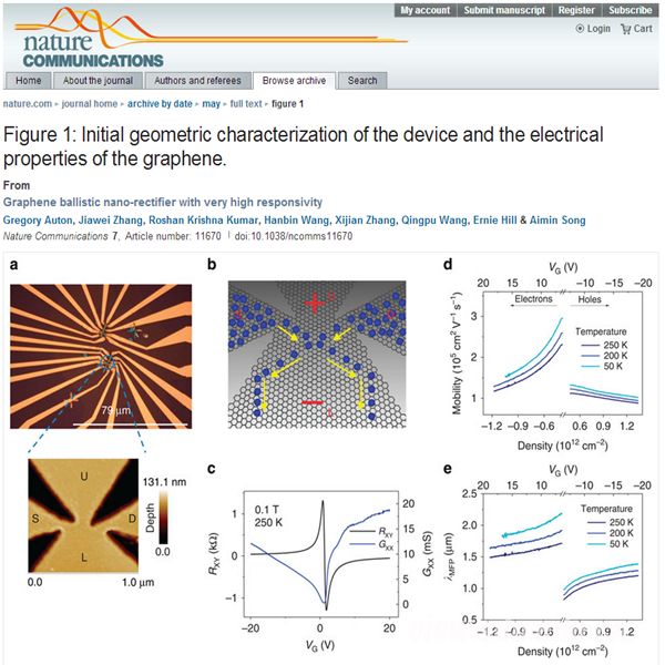 新型的石墨烯材料已经表现出广泛的应用前景,但其最深远的潜在应用是在电子工业领域。石墨烯中的载流子迁移率比常规半导体高出若干数量级,但是利用石墨烯高迁移率特性的新型电子器件结构却非常少。基于石墨烯的新型纳米弹道整流器采用高质量石墨烯,石墨烯材料迁移率为200,000 cm2/Vs。新型器件为单层结构,两输入端与两输出端正交,使器件的噪声只受热噪声限制。新型器件在室温下的等效噪声功率降至0.64 pW/Hz1/2,据悉,这是当前最灵敏的固态探测器。此器件的优异性能与超导辐射热测定器相当,但是后者需要工作在4K低温环境中。相关论文“Graphene ballistic nano-rectifier with very high responsivity于5月31日在线发表于Nature Communications(链接: