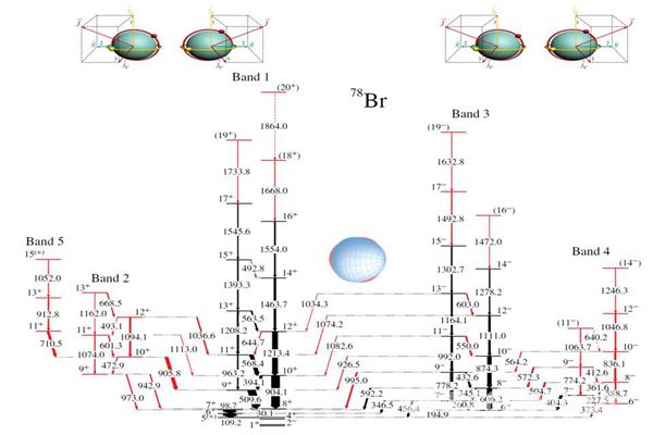 [本站讯]近日,来自山东大学(威海)、北京大学、北京航空航天大学、中国科学院理论物理所、清华大学和南非、匈牙利等国的科学家,利用南非iThemba LABS国家实验室的加速器和探测器阵列,通过重离子熔合蒸发反应研究了Br-78的能级结构,发现了两对宇称相反的手征双重带和它们之间的电偶极跃迁。协变密度泛函理论和粒子转子模型计算表明,这是多重手征双重带之间存在八级关联的证据。