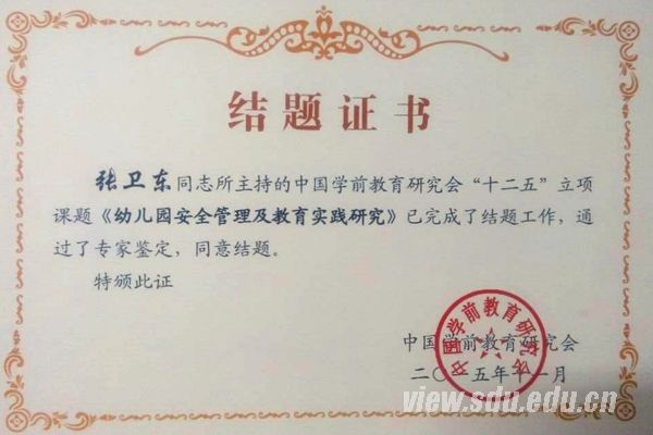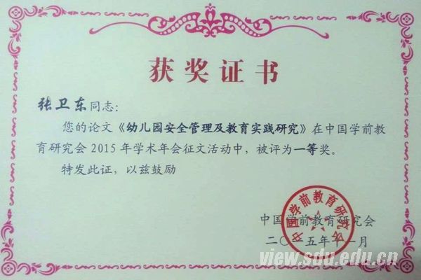 [本站讯]11月12日,中国学前教育研究会第五次会员代表大会暨“十二五”课题成果交流与表彰大会在福建省福州市举行。山东大学幼教服务中心的“幼儿园安全管理及教育实践研究”课题,经研究会学术委员会匿名评审,在全国381家单位中脱颖而出,通过了专家鉴定,顺利结题。幼教服务中心主任张卫东提交参评的论文《幼儿园安全管理及教育实践研究》,荣获该课题全国论文一等奖。