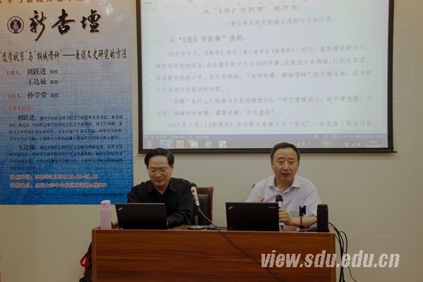[本站讯]5月29日晚,中国社会科学院文学研究所研究员、研究生院文学系教授、博士生导师刘跃进教授、王达敏教授做客文学院“新杏坛”,在中心校区为广大师生带来题为“‘选学妖孽’与‘桐城谬种’——兼谈文史研究方法”的讲座。讲座由文学院孙学堂教授主持,文学院孙之梅、李开军教授等出席活动。