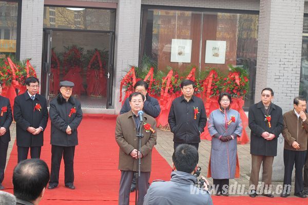 李建军在致辞中谈到,刘绍刚是山东大学的优秀校友,在大学就读本科期间,就表现出难得的艺术天赋和潜质,曾获全国大学生书法竞赛的重要奖项。毕业后,刘绍刚一直关注母校的事业发展,多次将自己精心创作的书法篆刻作品捐献给母校。今年9月底10月初,“百年墨缘——山东大学110周年校庆名人名家书画展”在中国国家博物馆展出,刘绍刚对此项活动给予了大力支持。另外,为了庆祝山东大学建校110年周年,他从《大戴礼记》、《荀子》、《孔子家语》等文献中选取了孔子论学语录,精心创作了孔子论学八条屏,捐赠给母校。尤其是为表达对恩师蒋维崧先生的感激和怀念之情,同时纪念蒋维崧先生诞辰九十六周年,刘绍刚捐资为蒋维崧先生制作了塑像,安放在山东大学中心校区。刘绍刚为人恳切,尊师重友,热爱母校,回报母校的拳拳之心令人感动。