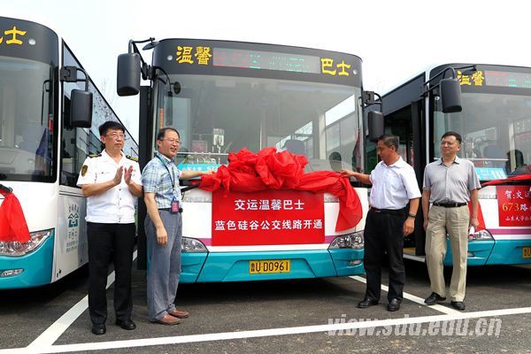 [本站讯]9月13日,交运温馨巴士蓝色硅谷公交线路开通仪式在山东大学青岛校区举行,由140辆纯电动公交车运行的5条公交线路正式开通,为首批入驻青岛校区的师生提供快捷、方便的公共交通出行服务。山东大学副校长、青岛校区建设指挥部总指挥张永兵,交运集团党委书记、董事长刘永康共同为公交线路开通揭牌。刘永康,蓝色硅谷管理局党委委员、副局长纪金亮先后致辞。青岛市交通运输委副主任邢昌友宣布公交线路开通。交运集团党委副书记、总经理王润杰主持了仪式。