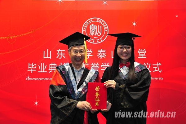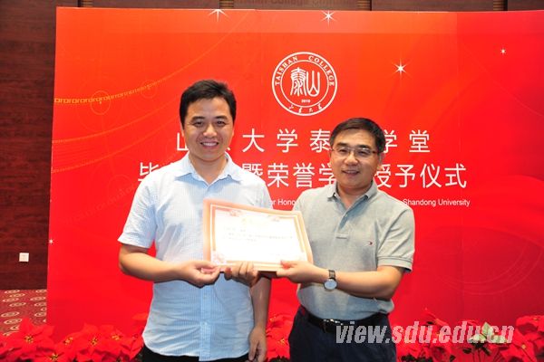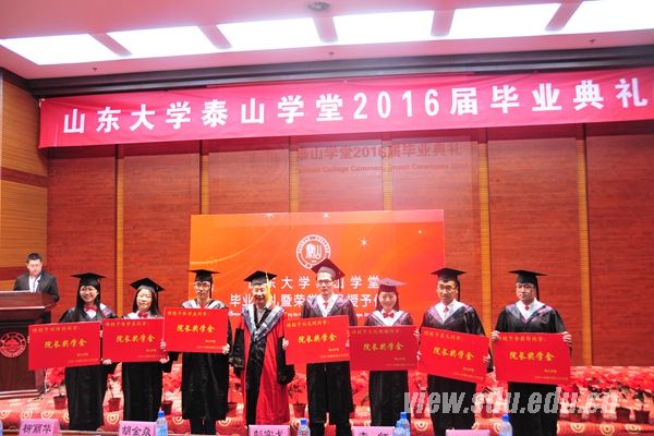 [本站讯]6月23日,泰山学堂2016届毕业典礼在中心校区举行。中国科学院院士、泰山学堂院长彭实戈,山东大学副校长胡金焱出席会议并讲话。彭实戈为学生颁发了泰山学堂院长奖学金证书及泰山学堂优秀毕业生、荣誉学员证书。胡金焱为泰山学堂海外拓展优秀个人、优秀培养团队及“毕业生最喜爱的老师”获得者颁发了荣誉证书。