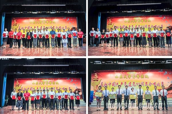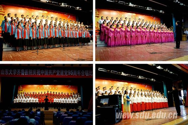 表彰结束后,庆祝建党95周年合唱比赛演出举行。此次比赛在院工会的精心组织和策划下,各党总支和相关职能部门高度重视,密切配合,10支参赛队伍、900余名医院职工参演。比赛演出内容以各党总支选送的大合唱为主,并穿插舞蹈、独唱等多种艺术表现形式,绘声绘色地回顾历史、感召未来。经过激烈的角逐,最终离退休党总支、妇儿神党总支获得此次合唱比赛特别奖;住院医师党总支、五官肿瘤党总支获评一等奖;外科党总支、机关党总支、内科党总支获评二等奖;五官肿瘤党总支、总务党总支、门诊党总支获评三等奖。整场活动隆重简朴、庄严活泼,气氛热烈、催人奋进,始终涌动着齐鲁医院人的热情和豪迈,抒发了齐鲁医院人心中对党的无限崇敬与忠诚。