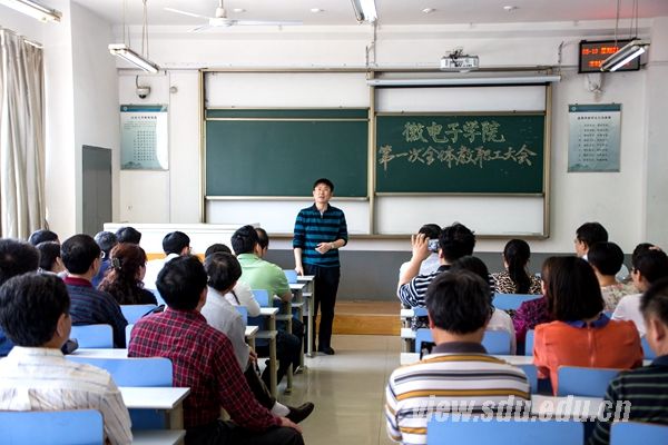 微电子学院常务副院长林兆军就学院近期的工作进展情况向学院全体教职工作了详细介绍,包括学院对本科生、研究生培养方案和管理方案的修订工作,微电子学院物理空间的建设情况以及正在进行的教育部第四轮学科评估等工作。副院长王永介绍了学院目前在本科教学方面的各项准备工作。微电子学院党委书记王卿璞主持会议并作总结发言,表示学院要有新的目标和计划,全院师生团结协作、振奋精神、开拓创新、奋发有为,为山东大学建设“双一流”大学贡献一份力量。微电子学院全体教职工参加大会。