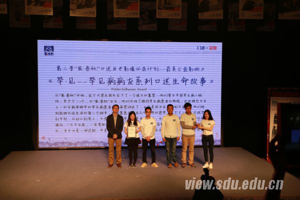 [本站讯]4月10日,第二届“家·春秋”大学生口述历史影像记录计划颁奖典礼在北京举行,由哲社学院的武玉宝、赵晓荃、刘秀秀、赵万林、孙荣甲五名同学所组成的团队,共提交两部摄影作品,其中《罕·见》斩获“最具公益影响力奖”,《回家》获得“最佳口述历史采访奖”提名,哲社学院副教授张洪英获得“优秀导师奖”提名。