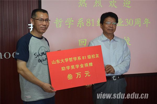 座谈会上,81级全体校友决定向哲社学院捐款设立“哲学81助学奖学金”,81级校友代表梁晓涛向刘杰院长转交了首期捐款。