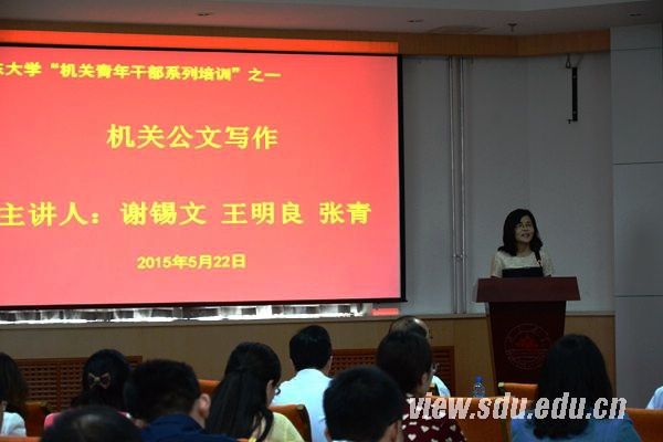 [本站讯]5月22日,山东大学机关青年干部系列培训第一期讲座在中心校区举办。本次培训专题为“机关公文写作”,山东省写作学会副会长、山东大学文学与新闻传播学院谢锡文教授,山东大学学校办公室副主任王明良,山东大学新闻中心副主任张青担任主讲人。山东大学机关党委书记张桂珍致辞。