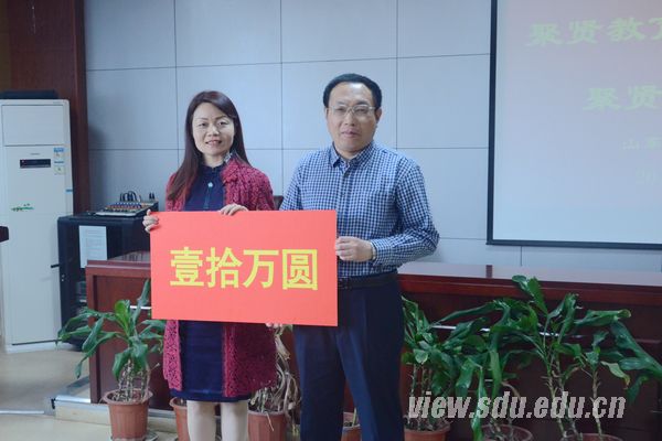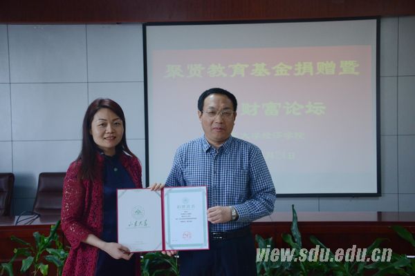 经济学院院长李长英代表学院接受捐赠并向捐赠人王鸿丽颁发捐赠证书,仪式由经济学院党委副书记李维林主持。深圳东方平昇投资管理有限公司合伙人、山东分公司总经理王鸿丽捐赠人民币10万元作为经济学院聚贤教育基金,支持经济学院人才队伍建设、引进海外优秀人才、开展学生工作。