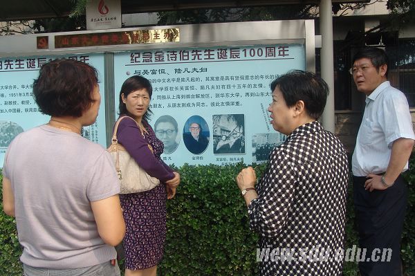 金诗伯教授用毕生精力倾心山东大学外语教学,在教学研究和人才培养等方面做出了重要贡献,他的名字将永远载入中国现代外语界学术史册。在新的时期,外语学院全体师生将秉承金诗伯先生的优良作风,学习和弘扬金诗伯教授的严谨治学精神,着力推动学院各项事业又好又快发展。