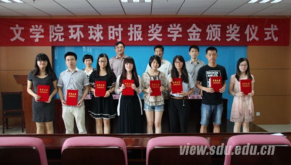 张帅宣读了《关于表彰2013—2014年度环球时报奖学金获得者的决定》,公布了本次“环球时报奖学金”获得者的名单。获奖学生代表、2011级本科生郝伟栋在发言中回顾了自己的大学经历,阐述了对自己肩上责任的认识,表达了他对文学院深深的热爱之情,并引用汪国真的诗歌表示在未来的日子里将继续努力学习和工作,以报答社会各界和领导老师的关心和期待。