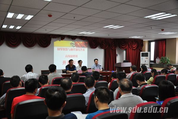 [本站讯]5月27日上午,历史文化学院“国学智慧与现代领导艺术”高级研修班开班仪式在山东大学中心校区知新楼举行。山东大学儒学高等研究院副院长、博士生导师黄玉顺教授受邀作了首场专题报告,历史文化学院党委书记赵爱国出席开班仪式并致辞,院党委副书记朱伟主持开班仪式。
