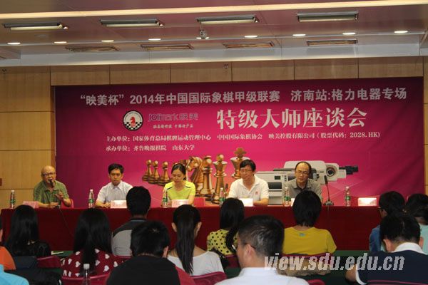 [本站讯]6月3日下午,“映美杯”2014年中国国际象棋甲级联赛特级大师座谈会济南站在山东大学中心校区举行。校团委书记马晓琳、中国国际象棋国家队总教练叶江川、映美控股有限公司市场部经理文泽强、浙江省国际象棋协会秘书长王文浩、齐鲁棋院院长刘玮出席座谈会。