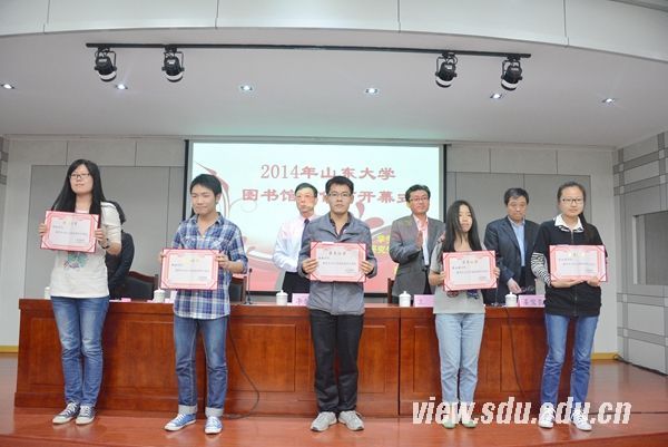 [本站讯]4月25日,以“乐书、悦读、求知、明理”为主题的2014年山东大学图书馆文化节在中心校区图书馆开幕。图书馆馆长李剑峰致开幕辞。校团委书记马晓琳宣读了文明读者、借阅达人、优秀学生馆员的表彰决定。参加开幕式的领导分别为文明读者、借阅达人和优秀学生馆员代表颁发了荣誉证书。