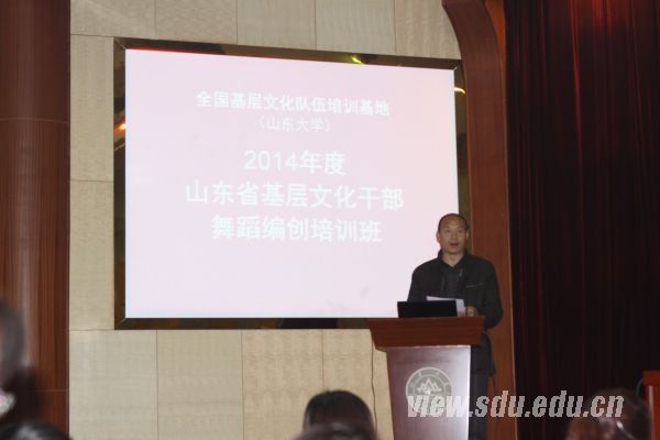李晓峰在致辞中向学员介绍了山东大学悠久的发展历史以及文化部全国基层文化队伍培训基地的总体情况,阐释了山东大学在近年来致力于世界一流大学的办学目标以及目前所取得的成绩,表示会与来自各市的文化工作者承担起培养文化人才、服务社会和服务大众的共同文化使命,为文化建设的大发展和大繁荣贡献力量。王尚以韩国的“文化兴盛”措施之一的“全民共享”对比我国文化建设提出的“文化均等化”,提出了要顺应时代潮流建设现代公共文化服务体系,促进政府从“办文化”向“管文化”的转变,并强调了文化服务中从“送”到“种”发展文化的转变。他要求参训学员在艺术创作过程中要让艺术作品更加接地气,提升艺术在社会文化建设中的引导作用。学员遵守纪律,认真学习,互相交流经验,发扬习近平总书记来山东考察时提出的“文化担当”精神,学以致用,通过编创好的舞蹈作品更好地践行群众路线。来自日照市艺术学校的苏立新代表全体学员表示在培训期间一定会遵守山大的校纪,秉承山大的优良校风,涵养儒家文化的优良品德,创新工作方法,开拓工作思路,切实提高业务水平和文化素养,把培训期间领悟到的知识应用到实际工作中去。