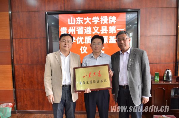 [本站讯]近日,山东大学赴贵州省开展教育拓展活动,先后在贵州师大附中、遵义县第一中学举行了山东大学优秀生源输送基地授牌仪式,同时举行了名师报告会和招生宣讲会。