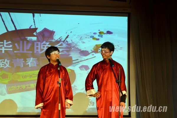 晚上在大学生活动中心举行了毕业晚会。水利班学生的双节棍表演精彩亮相,high爆全场,瞬间使晚会现场的气氛活跃起来。毕业的季节总是充满离愁。在歌曲《青春纪念册》和串烧《光阴的故事》中,毕业生们用歌声表达出了自己对学校的留恋与不舍。当然,晚会中也不乏各种劲爆的笑料。土木二班的舞蹈《甩葱舞》,搞怪滑稽的舞蹈动作令人忍俊不禁。在相声《那些年我们一起吃过的切糕》中,两名毕业生幽默地讲述了自己大学生活中的趣事。小品《山大好声音》的夸张表演获得在场观众的热烈掌声。歌曲《爱不爱我》、戏曲《钓金龟》、萨克斯独奏《东风破》展示了土建学子极高的音乐素养。小品《一战到底》的 “主持人”现场与老师互动,将现场的气氛推向高潮。最后,一曲《土木老男孩》将毕业生对母校的留恋、对同学们的不舍等毕业情愫表现得淋漓尽致。