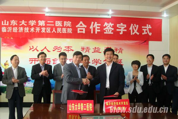 [本站讯]为加强医院之间的技术协作,充分利用双方医疗资源,实现优势互补、资源共享,推动临沂革命老区医疗卫生事业的发展,提高当地医院的医疗和管理水平,5月10日上午,第二医院院长赵升田代表医院与临沂经济技术开发区人民医院签署了合作协议书。临沂市人大常委会副主任、临沂经济技术开发区党工委书记徐福田,管委会副主任王文元等出席仪式。