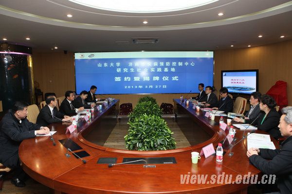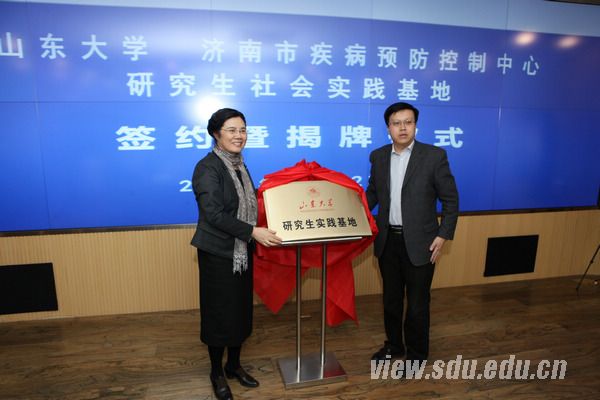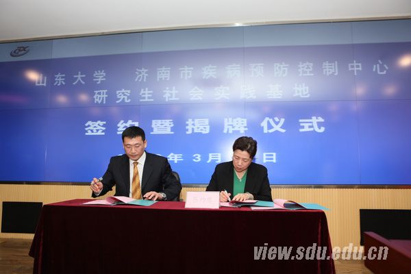 山东大学党委研究生工作部部长王君松与济南市卫生局党委副书记高萍共同为“山东大学研究生社会实践基地”揭牌;公共卫生学院党委书记王永平与市疾控中心党委副书记、副主任张济签署了协议。随后,张济向与会者介绍了济南市疾控中心的历史沿革、组织构成、主要业务范围以及近年来取得的丰硕成果。
