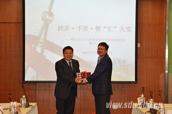 [本站讯]3月4日,山东大学总会计师曹升元一行赴苏州独墅湖科教创新区,与该区领导座谈交流了推动山东大学苏州研究院(以下简称“研究院”)发展事宜。苏州独墅湖科教创新区工委副书记、管委会常务副主任蒋卫明出席活动。 曹升元认为,苏州工业园区特别是独墅湖科教创新区的发展成就,是中国近20年高速发展的缩影。他介绍了山东大学的发展情况,表示研究院是山东大学系统的重要组成部分,要在服务苏州及长三角地区经济社会发展中作出较大贡献,同时也借力长三角的发展助推学校世界一流大学建设。蒋卫明简要回顾了与山东大学良好的合作经历,对研究院取得的成绩表示肯定;他表示将继续加强对研究院的调研、沟通和政策支持,希望与山东大学携手共同推动研究院更好更快发展。 会后,曹升元代表山东大学向独墅湖图书馆赠送了由山东大学出版社出版的《两汉全书》等150余册书籍。 访问期间,曹升元一行到研究院调研,听取研究院常务副院长吕明新的工作汇报;会见了苏州校友会的校友代表,参观考察了部分校友企业。此外,曹升元一行还专程拜访了美国唐仲英基金会中国办事处主任孙幼帆等。 山东大学合作发展部部长王飞;苏州独墅湖科教创新区工委委员、管委会副主任章小英、沈丽娟,苏州工业园区教育投资有限公司副总经理姚建新,苏州独墅湖图书馆执行馆长林蓉,苏州独墅湖科教创新区管委会有关部门的负责人等参加了相关活动。 苏州独墅湖科教创新区位于苏州工业园区南部,面积25平方公里,在校生7.5万人,教职工4700余人,是集教育科研、新兴产业、生活配套为一体的现代化城区。山东大学苏州研究院于2012年5月入住该区。