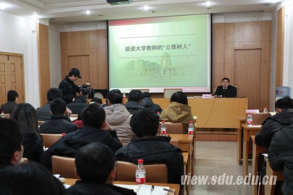 国家级教学团队带头人、山东省第6届教学名师胡金焱教授以“大学教师的立德树人”为题与青年教师进行研讨,结合自身求学与教学经历,将“教师事业”概括为:“师才、师技、师艺、师德、师责、师爱”六个方面。他说,大学教师要有“创造知识、传授知识、正身立德、树人育才”四大“职”责;要有“爱教书、爱科研” 两种兴趣和“教好书、科研好”两种能力;要有四种情怀,即:事业感、满足感、爱心和责任心;要对教学的上心和精心,注重教书更注重育人。胡金焱还表示,教师应有思想,但要做到深刻而不尖刻、尖锐而不片面、理性而不随性、批判但不反叛、标新立异而不哗众取宠,教研相长以相得益彰。整个演讲轻松幽默、深入浅出,富有感染力。张树永教授介绍了开展教学研讨班的意义,着重谈了青年教师应如何规划自己的教学能力发展。他将高校教师职业生涯的发展经历分为三个发展阶段:第一阶段是学徒期,教师在新入职的2-3年内需要经验丰富的老教师加以指导并参与相关培训;第二阶段是熟练期,经过一段时间的教学积累,教师将所教内容烂熟于心,全面地参与到课程的建设中去;第三阶段是专家期,此时教师致力于争取自身在学科领域中的地位,并能够指导新教师等。他对青年教师在各个阶段的发展提出了有针对性的建议,并鼓励青年教师把课教好。张树永教授朴实无华的发言博得了与会青年教师们的热烈掌声。