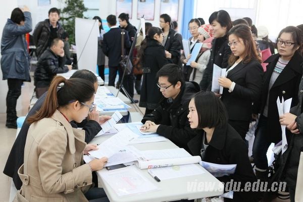 招聘现场人头攒动,有条不紊,穿着正式、成熟稳重的莘莘学子成为了校园内一道亮丽的风景线。来自2009级韩国学院的王琰倾向于韩语翻译方面的岗位。在招聘现场,她发现了不少“对眼”的企业,“今天的面试很顺利,”王琰高兴地说,外语能力为她增加了不少筹码。