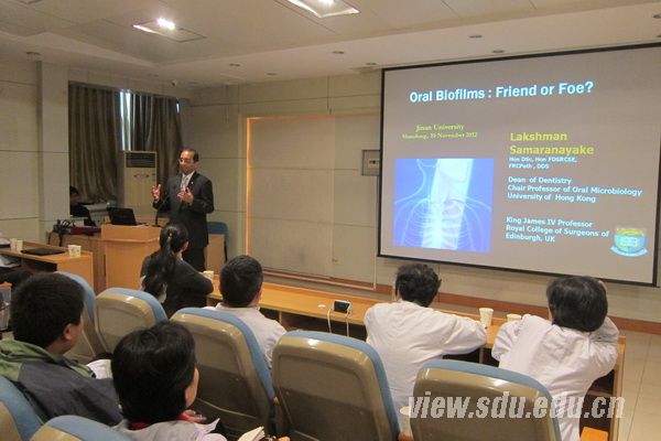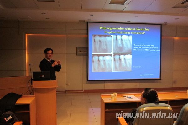 Samaranayake教授给学院师生作了题为“Oral Biofilms and Systemic Disease”的学术报告。他就口腔生物膜与系统疾病之间的联系作了详细的讲解,以自己独特的见解分析了口腔微生物与全身健康的关系,并对口腔微生物学的研究前景进行了展望。张成飞副教授作了题为“Pulp Regeneration,Where we are?”的学术报告,结合大量临床案例,从根管预备、根管消毒、根管内药物放置等方面介绍了牙髓再生技术的最新研究成果。