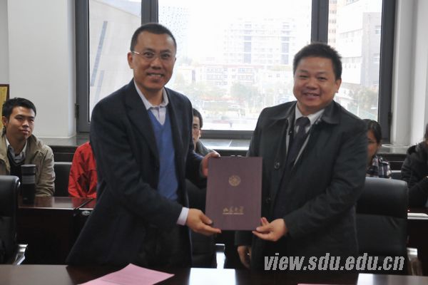 [本站讯]11月12日下午,中国建设银行山东省分行行长薛峰受聘为山东大学兼职教授。山东大学总会计师曹升元为薛峰颁发了聘任证书。