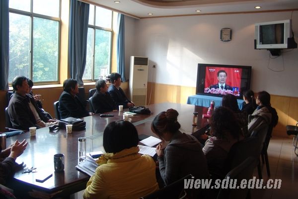 外语学院高度重视党的十八大,确保师生在第一时间了解大会盛况,学习大会主要精神,深刻认识大会的历史意义和目标任务。学院开辟了两个会场,运用多媒体设备,组织院党委中心组成员、各党支部书记和部分党员师生集体收看十八大开幕式。此外,学院还积极组织其他教职工和学生通过山大视点网站的视频直播入口自主收看。在收看开幕式的过程中,大家聚精会神,不时为胡锦涛总书记的报告打动、鼓舞,同时表示坚决贯彻十八大精神,增强认识,加强学习,提高素质。