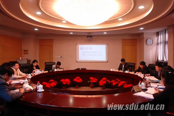 曹升元对东北大学代表团来山大访问表示欢迎。他简要介绍了学校历史、办学规模、办学目标和办学特色等基本情况,并就学校进行“天大之事”——建设世界一流大学与“地大之事”——青岛新校区建设进行了介绍。芦延华介绍了东北大学的发展历史、目前的发展状况、学科特色、资产管理状况及招标采购工作开展情况,表示希望通过学习借鉴山东大学的经验,在管理理念、制度建设、规范化、科学化方面推动东北大学有关工作的发展。