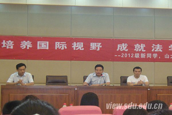 会上,齐延平在讲话中谈到,法学院的办学条件在国际堪称一流,可以比肩世界名校。学院充分响应“建设世界一流大学”的办学目标,全力支持学生走出国门继续深造,致力于拓展学生的国际化视野,培养适应现代社会需要的涉外法律人才。齐延平提出,“国际化”这一措施并不是一个新的课题,法学在本质上是一种西学,中国最早的法学教育,东吴大学法学院就是实行的国际化教育。山大法学院提出的“国际化”教学是一种对历史的回归,是对法学教育的追本溯源。为此,学院出台了多项措施鼓励学生出国留学,大力支持同学们拓展国际化视野。例如,学院设立专项资金承担同学们雅思、托福等考试的报名费,对参加考试成绩突出和成功申请海外留学的学生给予奖励,承担学生出国留学返回母校时的机票费用等等,这些举措在国内法学院都是首创。学生自身应当改变观念,开阔视野,努力提高外语水平和专业能力,使自己达到国际一流的人才标准,真正成为现代社会需要的的高端法律人才。院党委副书记王苗雨发表讲话。她简单介绍了山东大学的办学宗旨和办学目标以及法学院的发展历史、人才培养目标,使同学们对山东大学以及法学院有了初步的了解。她还从同学们比较关心的就业问题入手,介绍了法学院近年来的就业情况,引导同学更好地做好学业和职业规划。在对同学们的就业意愿进行现场调查后,她提出,同学们不能仅仅把目光局限在公务员、选调生这个层次,而应开阔视野,转变观念,抓住机会,走出去,在更广阔的国际舞台大有作为。