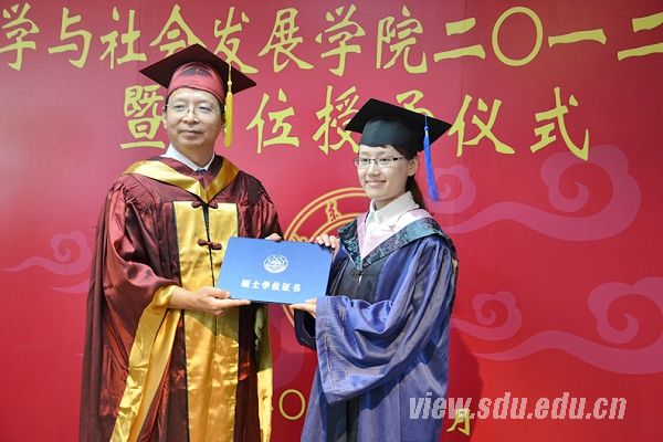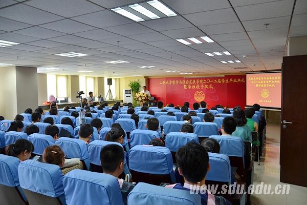 在庄严雄伟的国歌声中,典礼拉开序幕。刘杰首先致辞,向全体毕业生顺利毕业表示祝贺,并从著名社会学家布迪厄先生的《国家精英》一书谈起,鼓励同学们胸怀伟大抱负、承担社会使命,自信独立,不仅要积极学习知识和技术,更要有一颗仁慈悲悯的心,积极投身于公共生活,做社会的精英。随后,教师代表程胜利发言。他从自己的《社会统计学》课程入手,以亲身经历分享了自己对为人做事的感悟,并从研究学科方向出发,鼓励同学们对未来常怀好奇之心,以不懈的坚持和努力应对未知和无穷的可能性,将所学知识运用到实践中,实现自身价值。校友代表、2005级社会工作专业毕业生张志海工作三年以来一直扎根于“基爱”残障人服务中心。没有丰厚的报酬和令人瞩目的权位,作为一名基层社会工作人员,他用自己的知识和爱心帮助无数自闭症儿童和残障儿童康复和成长。他的讲话为每个毕业生带来了心灵的震撼,这种平凡中的伟大,在坚持和努力中实现自我的精神赢得现场观众热烈的掌声。2009级宗教学专业硕士王强伟代表全体毕业生发言。他回顾了在山大七年的求学历程,感谢母校、学院和老师们的培养与教诲,也代表全体毕业生承诺,今后必将秉承山大赋予的浩然之气,追摹前辈和老师们的道德文章,永远坚持走向上的路,追求正义和智慧,实现人生的理想。最后,副院长任丽新宣读了《关于授予2012年毕业生博士、硕士和学士学位的决定》,副院长宋全成宣读了《山东大学2012届优秀毕业生表彰决定》,在山东大学校歌激昂向上的旋律中,刘杰受徐显明校长委托向学院毕业生颁发了学位证书。