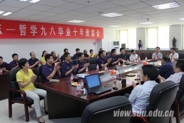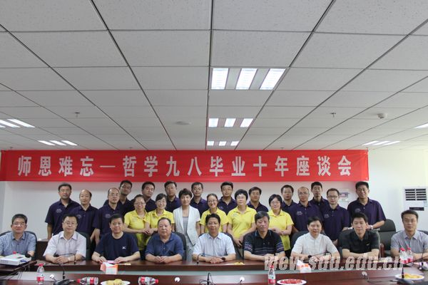 [本站讯]近日,“师恩难忘——哲学系98级毕业十周年座谈会”在中心校区举行。哲社学院院长刘杰、党委书记杨斌出席会议。哲学系98级的19名学生从全国各地赶来参加了活动。 刘杰向校友们返校表示欢迎,介绍了98级学生毕业离校以来学院的建设和发展情况,并结合同学们的发言谈了对“哲学之用”的理解。杨斌对校友重回母校、支持学院发展表示感谢,祝福大家事业有成,有更大发展。哲学系98级授课教师代表王新春、刘陆鹏、何中华、颜炳罡,辅导员苗桂林、张帅纷纷发言,表达了对校友们的欢迎和祝福,交流了哲学在人生发展和工作岗位上的意义和价值。哲学98级校友分别介绍了自己的工作和家庭情况,深情回顾了大学期间老师的培养,对母校的关怀、老师的教诲表示感谢,同时表达了回报母校、回报老师的决心。