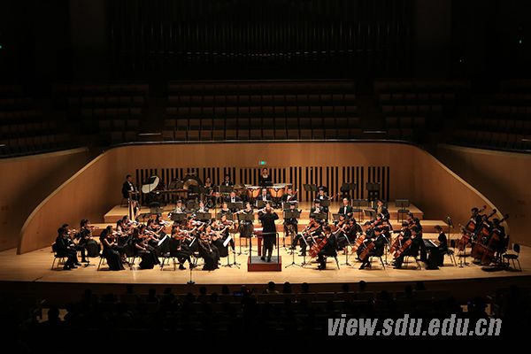 音乐会在大家熟悉的的比才《Carmen》(卡门)前奏曲的旋律中正式开始,观众们被欢快的旋律所感染,现场气氛热烈。在卡门前奏曲与3首间奏曲结束后,交响乐团的师生们为大家带来了芭蕾舞剧版《屋顶上的公牛》,在曲目开始前,主持人讲解、山东大学交响乐团向大家讲解展示了两个音乐片段,一是乐曲的主题:来自巴西民间歌曲,运用摇摆节奏,旋律重音不在通常的重拍上;二是南美特色打击乐器—刮鱼展示,特殊的演奏方式和前所未见的乐器更加的吸引更多观众关注的目光。接下来是由艺术学院兼职教师董乐晨带来的单簧管独奏,他与乐队合奏完成了米约《Scaramouche》(丑角)协奏曲,精湛的演奏技巧与完美的音乐表现力,博得了现场观众的热烈掌声。中场休息过后,山东大学交响乐团为大家演奏了拉威尔的《Pavane pour une infante défunt》(悼念公主的帕凡舞)和《Ma mère l’Oye》(鹅妈妈组曲)。最后,返场曲目《丑角》第三乐章精彩上演,观众们随着音乐的节奏鼓掌,全场气氛达到高潮。