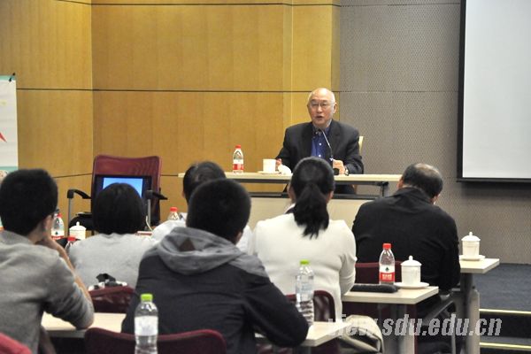 项怀诚发表讲话,感谢山东大学对桥牌活动的大力支持,肯定了山大举行讲座活动的重要意义,表示中国桥牌项目在国际上具有重要影响力,一系列中国选手在国际性的桥牌比赛上屡创佳绩、为国争光,但当前桥牌面临着一个大范围普及的重要任务,桥牌界专业人士应当仁不让承担起这一职责。项怀诚鼓励山大师生积极参与桥牌活动,从玩桥牌中学习追求完美、坚持不懈的精神,努力提升个人素质。