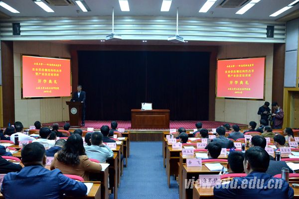 [本站讯]4月7日,由山东发展研究院承办的“山东大学——河南省驻马店市农业供给侧结构性改革暨精准扶贫培训班”开班典礼在中心校区举行。山东大学常务副校长王琪珑出席典礼并致辞。