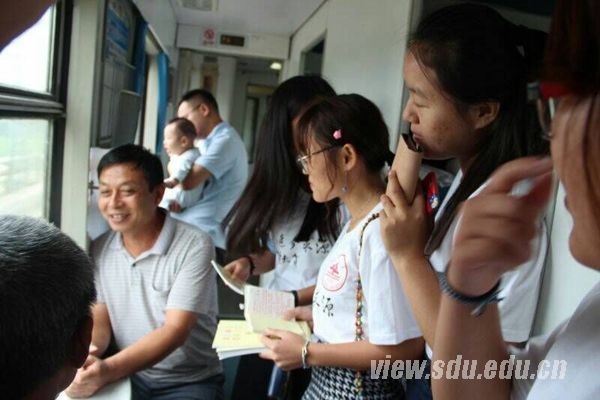 在乘坐火车的途中,实践队队员对旅客进行关于惠民政策方针和红色革命事迹的宣讲,并对旅客在扶贫养老和医疗保险等方面的问题进行答疑,同时向旅客分发健康知识手册,引起旅客浓厚兴趣。在与火车的旅客进行交流的过程中,实践队队员了解到大家对中国共产党的许多红色革命事迹很有兴趣,而一些年纪大的老人也能向队员讲一些他们熟知的革命事迹,让队员丰富了革命知识,同时也提高自己的党性和觉悟,以更严格的标准要求自己,做一名优秀的党员。