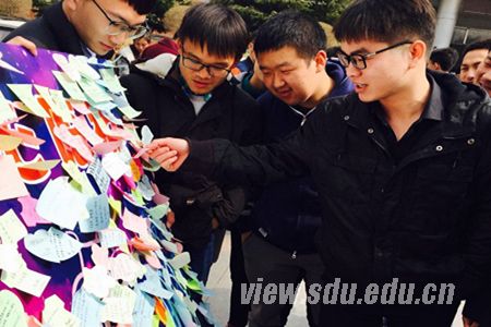 学院青年志愿者联合会的志愿者们将贴满心愿的“心愿墙”准备就绪。工作人员有的卖力喊着宣传词,有的则蹲在地上仔细检查每一张便利贴,以防被风吹走。伴随着下课铃声的响起,越来越多的男生聚集在心愿墙前,活动现场热闹非凡。牵走愿望的男生来自各专业,但是在这一天,他们有了一个共同的名字——取愿人。