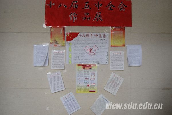 此次展览向护理学院全体本科生及研究生征集作品,作品内容有关自身对十八届五中全会的心得体会等,作品形式不限。此次征集的作品内容形式多样,有同学们手绘的五中全会画报,有内容丰富的会议解读海报,还有同学们充分了解十八届五中全会后写下的心得,更有甚者将自己对十八五的理解以PPT的形式制作出来加以彩印,作品简洁明了又不失生动形象。护理学院将这些优秀的作品展示在学院大厅,并以展板的形式展示在趵突泉校区图东门口,以便更多的人能欣赏这些作品,同时学习贯彻十八届五中全会精神。