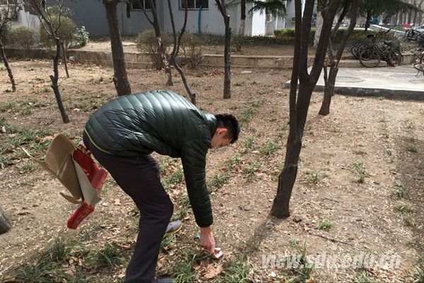 中午12时30分,中心校区的校园清洁小分队也行动了起来。七名志愿者先后于稷下广场、学生公寓区和教学楼附近的草坪进行垃圾清理活动。志愿者们仔仔细细,不怕脏不怕累,力求不错过一点垃圾。校园保洁人员看到志愿者们,还主动借给志愿者们打扫工具。