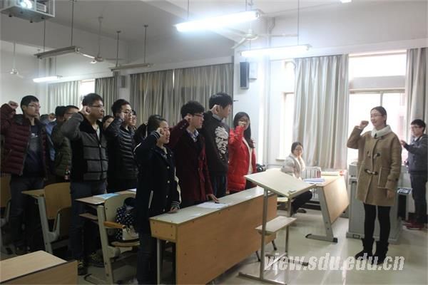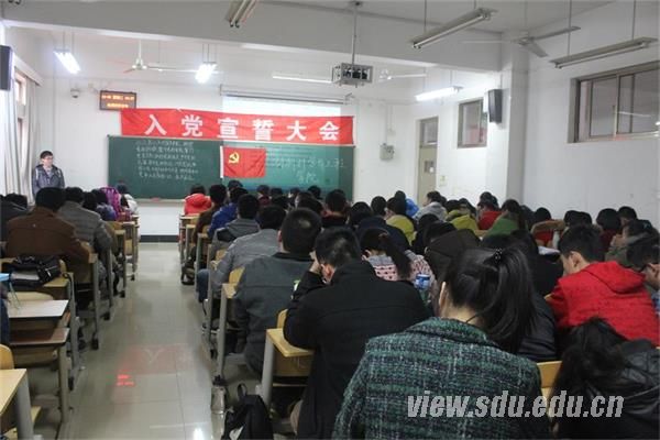 会议伊始,主持人苏宝献介绍了“12·9”的由来及其重要意义,同时全体起立齐唱《国际歌》,宣誓仪式正式开始。全体预备党员起立,在领誓人吴梦琦的带领下面向党旗,举右手握拳庄严宣誓。随后,党员代表石金铭,预备党员代表张烨,入党积极分子代表李高分别发言,表达了他们作为一名党的忠实拥护者对自身的要求。