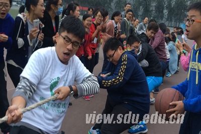 下午进行的是年级对抗赛,在男女四乘一百米接力赛中,各年级运动员团结协作、奋勇向前,比赛过程中一位选手鞋子掉落,为了集体成绩竟光脚跑完全程,这种竞赛精神让现场观众纷纷起立鼓掌,为之加油鼓劲。男女500 米长跑,运动员们的脚步从未停滞,让我们真正感受到他们的拼博精神与顽强意志。各种以娱乐为主的趣味项目,如障碍跑酷、集体跳大绳、二人三足、搭桥过河等在年级对抗赛过程中穿插进行,欢笑声充满了比赛现场,参加比赛的同学都感觉意犹未尽。最受关注的拔河比赛最后进行,本科生、研究生共6支队伍经过抽签捉对厮杀。场上,各年级运动员竭尽全力,场下,观众的助威声、呐喊声响彻运动场。最终,本科2013级获得拔河比赛第一名,总成绩桂冠则由本科2015级摘得。除此之外,运动会还设置了整点抽奖环节,让观众也能积极参与到活动中。