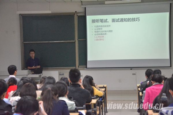 孙磊针对应届毕业生详细地介绍面试的技巧和注意事项。他首先展示企业的招聘和个人就业的流程,知己知彼方能百战百胜,他提醒同学要准确把握招聘的流程,提前做好准备,不要因自己疏忽而失去机会。随后,他详细介绍面试的三个过程。第一过程是面试的准备,他从硬件和软件两个方面,穿插有趣的故事并结合自身的经历,告诉同学们如何在面试前做好充分的准备;第二过程是面试的表现,他深刻剖析无领导小组讨论法、行为事件访谈法、压力面试法三种面试方法,引用一些行业的面试题,详细讲解应试技巧并告诉同学要随机应变,根据招聘单位的性质找准自己的位置,注意面试中的细节,不要因小失大;第三过程是面试后的现场整理、总结和跟进,他提醒同学们不能忽视这项环节,这个环节能为面试再赢取一定的分数或者完善自己,为下一次的面试积累经验。最后,他提出面试者要端正态度,充分准备,灵活应变,争取在面试中展示最好的自己。培训结束后,孙磊和同学进行了积极的互动,解决了同学们关于面试当中的问题。最后,他希望同学们能准确把握机会,展示精彩,找到一份适合自己的工作。