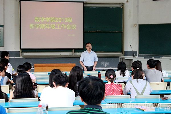 [本站讯]近日,数学学院2013级本科生在中心校区召开新学期年级工作会议。数学学院党委副书记李勇参加会议并向同学们详细介绍了数学学院本科生的研究生推免、海内外访学、评奖评优、学涯职涯规划、就业指导、心理健康教育、学院品牌活动建设以及日常安全教育等各项情况,并安排了2013级近期的具体工作和活动。