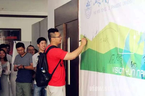 本次艺术考察展开幕式由班长陈壮主持,他详细介绍了12级视传专业整个西南艺术考察的全过程,并代表全班同学向带队老师唐绍钧表达了衷心的感谢。随后,开幕式进行了简单的签字出场仪式。在陈壮的邀请下,艺术学院党委书记史永志在大幅展览海报上签下第一个名字作为开端,所有参展老师和12级视传同学依次将自己的签名写在大幅海报上。最后,在艺术学院各位专业老师的共同评选下,选出了八幅优秀作品,并为作品作者进行了颁奖。