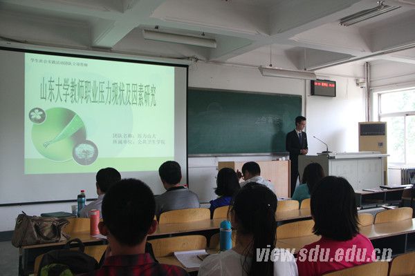 2015年度暑期社会实践团队共计58个,大都是就指导老师给出的课题自行组成六到十人的队伍。此次答辩会中,所有团队分为两大组,在两间教室同时进行答辩。答辩会邀请到了马伟、杨丽萍、司纪亮等十位老师作为评委。