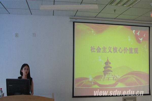 讲座开始,来自校社会主义核心价值观宣讲团的主讲人李杭耘以几个社会主义核心价值观主题的宣传短片作为开场,引入主题,进行社会主义核心价值观的相关介绍。她首先对社会价值观的发展历史进行了回顾,由封建社会的儒家思想延伸到现在的社会主义核心价值观。接着,她从国家、社会和公民三个层面详细讲述了24字社会主义核心价值观的内涵,其中穿插了许多小故事和小视频,让同学们对此有了更加切身的体验。最后,李杭耘还以一些名言警句鼓励大家学习先进人物的精神,从一个公民的立场出发,积极弘扬社会正能量,在生活和学习中践行社会主义核心价值观。随后进行的是关于“八字真言”主题团会的经验分享和交流环节。来自2013级旅游管理、信息管理等五个团支部的团支书相继上台发言。她们从会前准备、工作规划、班会形式、活动成果等几个方面进行了讲述,分享了一些经验.例如可以通过观看小视频、个人演讲等方式调动同学们的积极性,还可以通过会前讨论、微信平台征集建议等方式提高同学们的参与度。