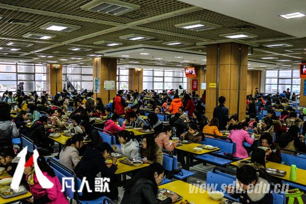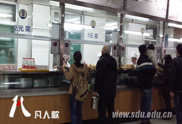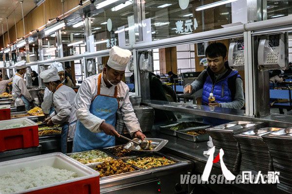 17:10:食堂一层已然十分的忙碌。在同学们有序打饭时,王师傅带着脸上憨直的笑容询问每一位在窗口徘徊的学生:“要什么,同学?”