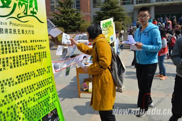 [本站讯]3月27日,山东大学土建学院青志协公益项目部举办关爱尘肺病患者的宣传活动。尘肺病是由于在职业活动中长期吸入灰尘,并在肺内滞留而引起的以肺组织弥漫性纤维化(瘢痕)为主的全身性疾病,该病伴有咳嗽、咳痰、呼吸困难等症状,严重者甚至引发咯血。志愿者希望通过宣传活动引起大学生对该病患者的关注,并尽可能为患者提供帮助。